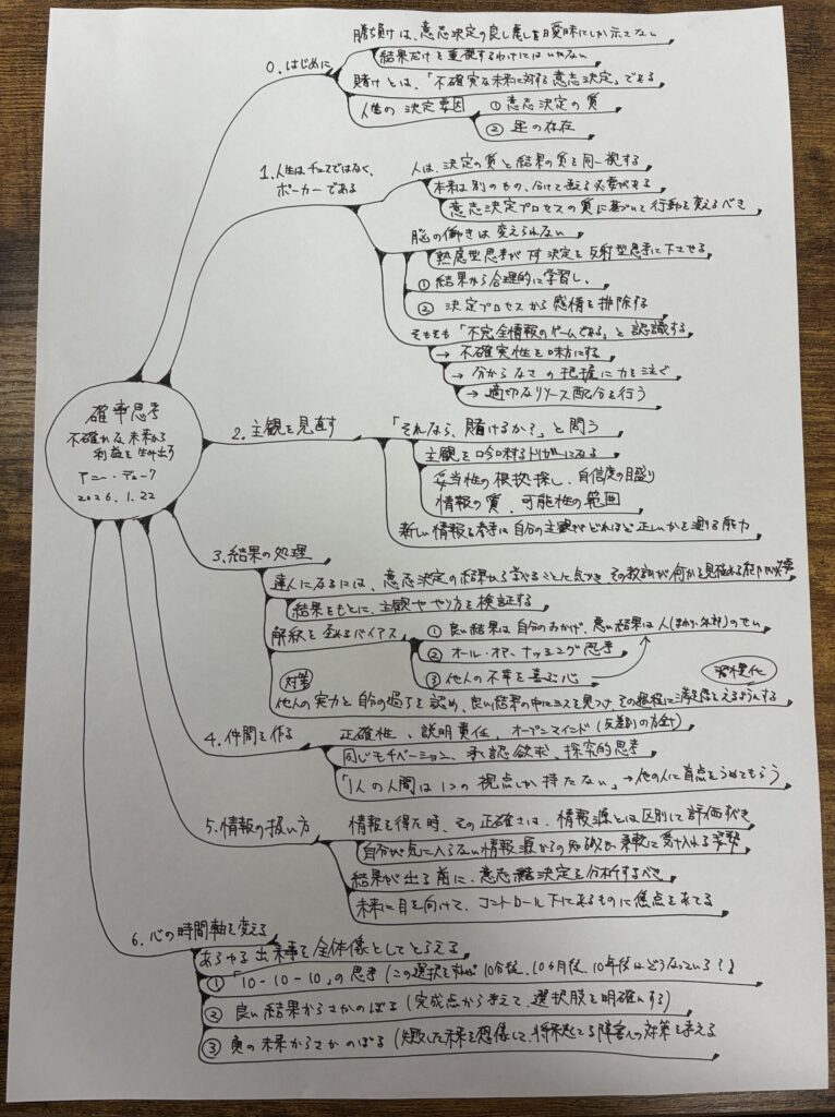 意思決定を結果と切り離して評価することの大切さを説明するのが本書の趣旨ですが、私はこれまで、結果(勝ち負け)に引きずられすぎて、意思決定そのものをきちんと評価できていなかったことに気づかされました。